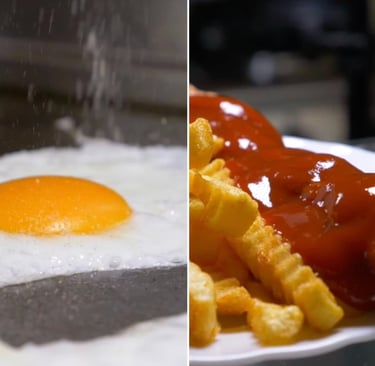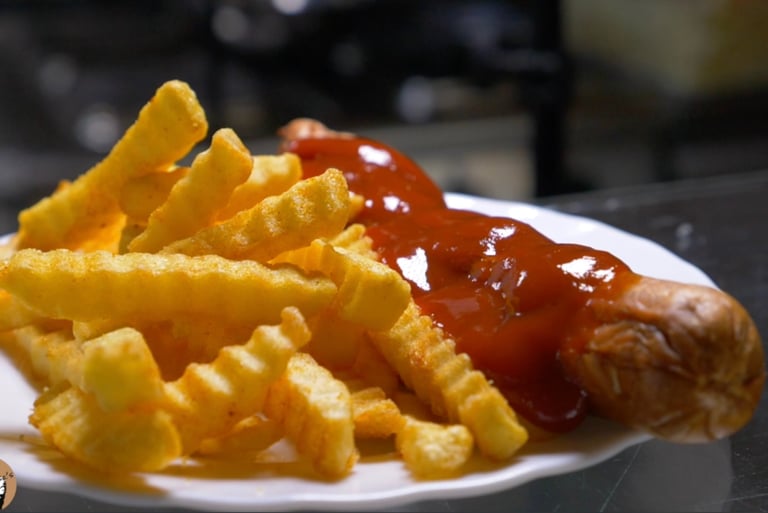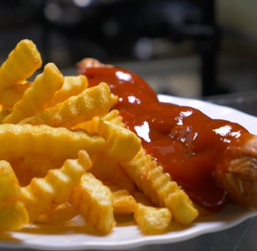 Zum Mittag täglich wechselnde deftige und warme Speisen und ganztägig Currywurst, Pommes Frites, Kartoffelsalat und weitere Imbiss - Klassiker.